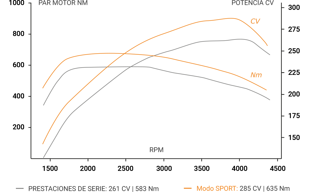 El software de RaceChip aprovecha de forma eficiente las reservas de potencia del motor. La reprogramación está igualmente limitada por las reservas de potencia disponibles, si no se quiere dañar el motor a largo plazo.